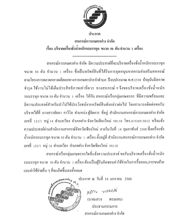 สหกรณ์การเกษตรฝาง จำกัด มีความประสงค์ที่จะบริจาคเครื่องชั่งน้ำหนักรถบรรทุก ขนาด 50 ตัน จำนวน 1 เครื่อง ซึ่งเป็นทรัพย์สินที่ได้รับการอุดหนุนจากกรมส่งเสริมสหกรณ์ ปัจจุบันมีสภาพชำรุด ใช้งานไม่ได้เต็มประสิทธิภาพเท่าที่ควร จึงขอบริจาคเครื่องชั่งน้ำหนักรถบรรทุก ขนาด 50 ตัน จำนวน 1 เครื่อง ให้กับสหกรณ์หรือกลุ่มเกษตรกร ที่มีความพร้อม และมีความประสงค์สำหรับนำไปใช้ประโยชน์จากทรัพย์สินดังกล่าวต่อไป โดยสามารถติดต่อขอรับบริจาคได้ที่ นางสาวลัดดา กาวิโล ตำแหน่ง ผู้จัดการ ที่อยู่ สำนักงานสหกรณ์การเกษตรฝาง จำกัด เลขที่ 121/1 หมู่ 14 ตำบลเวียง อำเภอฝ่าง จังหวัดเชียงใหม่ 50110 โทร. 0-5345-3012 หรือแจ้งความประสงค์ผ่านสำนักงานสหกรณ์จังหวัดเชียงใหม่ ภายในวันที่ 14 กุมภาพันธ์ 2568 ซึ่งเครื่องชั่งน้ำหนักรถบรรทุก ขนาด 50 ตัน จำนวน 1 เครื่อง ตั้งอยู่ที่ สำนักงานสหกรณ์การเกษตรฝาง จำกัด เลขที่ 121/1 หมู่ 14 ตำบลเวียง อำเภอฝาง จังหวัดเชียงใหม่ 50110 สหกรณ์หรือกลุ่มเกษตรกรใดที่แจ้งความประสงค์ ขอรับบริจาคเครื่องชั่งน้ำหนักรถบรรทุก ขนาด 50 ตัน จำนวน 1 เครื่อง ต้องเป็นผู้รับผิดชอบค่าใช้จ่ายในการรื้อถอน การขนย้าย และค่าใช้จ่ายอื่น ๆ ที่จะเกิดขึ้นเองทั้งหมด